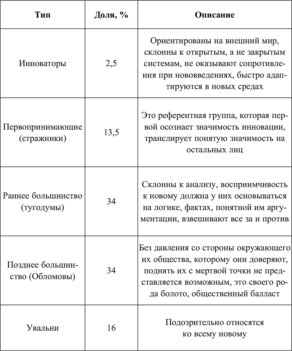 Большое значение имеет теория диффузии идей Э. Роджерса, в рамках которой рассматривается модель распространения любой новой информации, а следовательно, и PR-сообщений. Основанием этой очень популярной классификации является уровень адаптивности и восприимчивости к новым процессам, явлениям, объектам, это своего рода некий вызов традиции или мейнстриму. Чаще всего стимулом является провокация. Отобразим классификацию Э. Роджерса в виде таблицы 5.