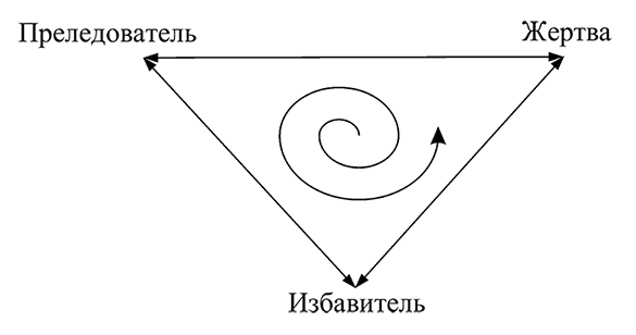 Интересной моделью является также треугольник судьбы (треугольник Карпмана). Это модель устойчивых ролевых взаимоотношений. Героями этой фигуры являются жертва, преследователь и избавитель. Каждый участник треугольника Карпмана почувствует себя и преследователем, и жертвой, и избавителем. Этот процесс называется карпмановским вращением. Схематично эта модель может выглядеть так: