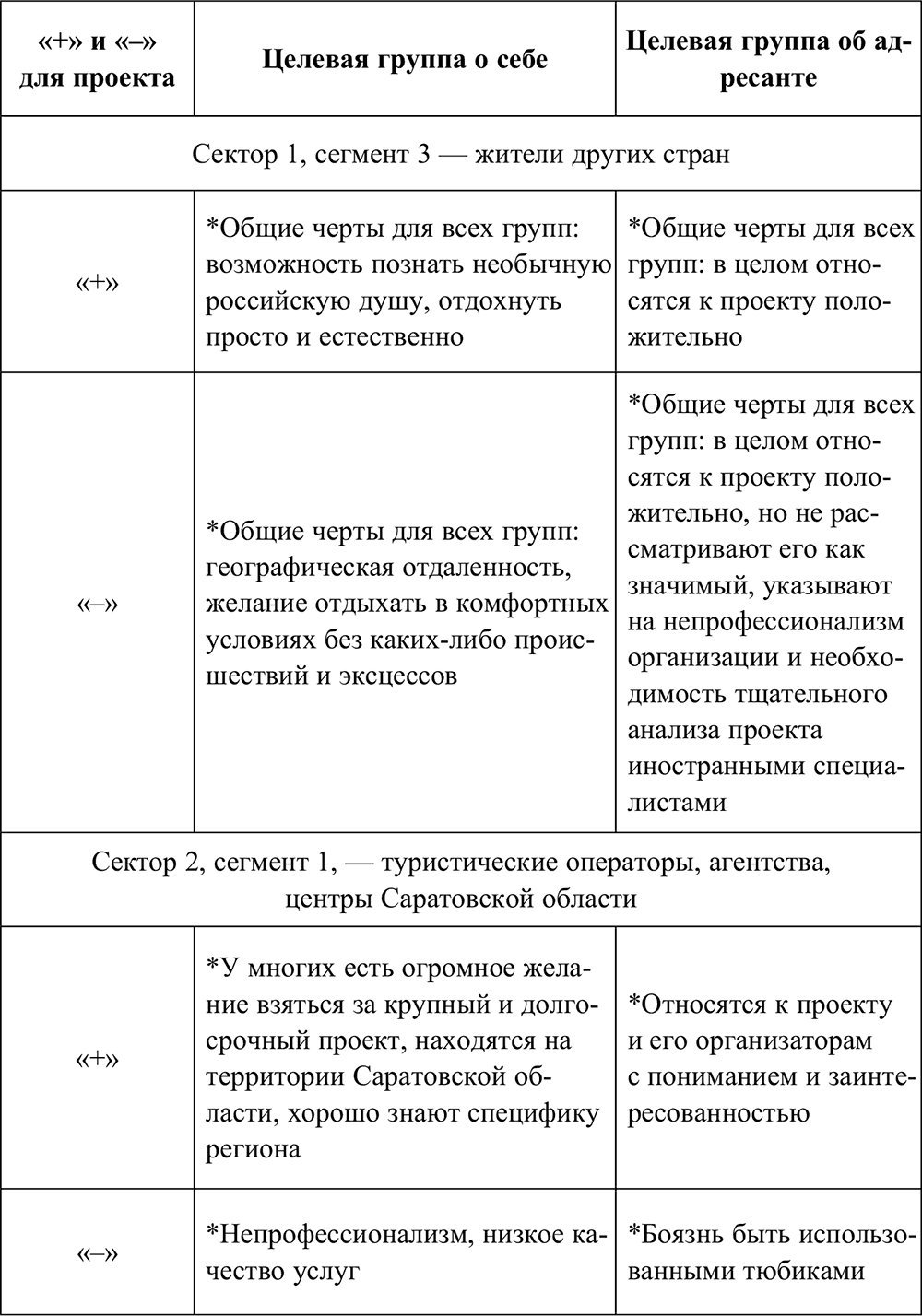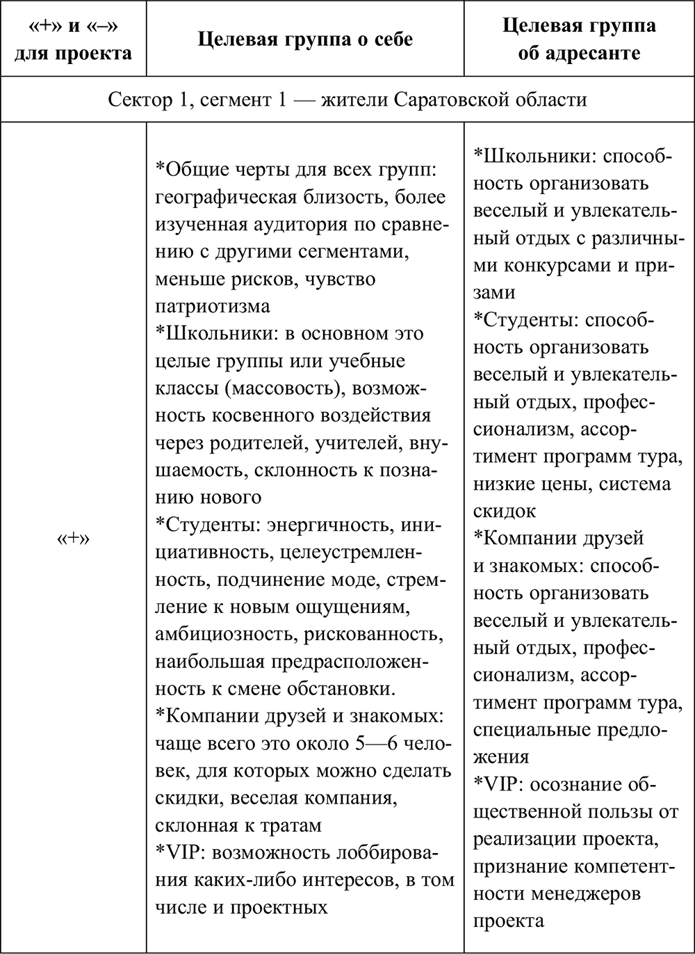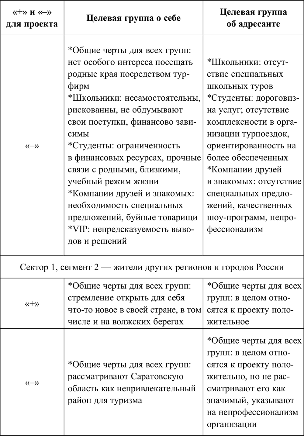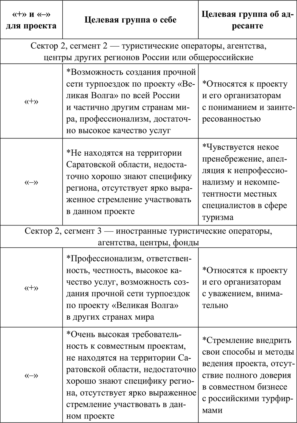 Анализ второго и третьего сегментов. Применительно к данному проекту второй и третий сегменты опосредованы первым. Дело в том, что реализацию проекта планируется передать на трендовой основе (при финансовой поддержке правительства Саратовской области) турфирмам Саратовской области, что позволит тем самым подтолкнуть туристический бизнес Саратовской области к развитию своего туристического продукта.