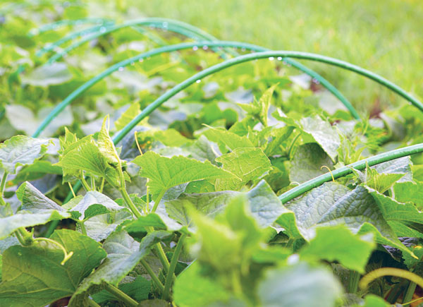 Как только минует угроза заморозков (10–12 июня), огурцы открывают, на грядки ставят дуги высотой 80–90 см и на них кладут плотный белый укрывной материал, покрывающий грядку со всех сторон. Если не накрыть грядку, то огуречные листья от яркого солнца становятся очень грубыми, жесткими и колючими, ломаются, желтеют, буреют, а завязи при этом желтеют и засыхают. Урожай быстро сходит на нет. Если огурцы самоопыляемые, укрывной материал не снимают в течение лета за исключением полива, подкормок и сбора урожая.