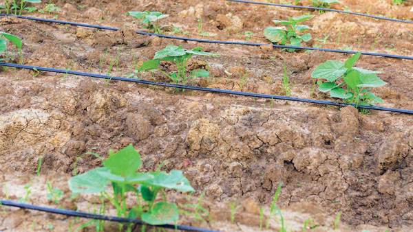 Затем готовим горячий раствор: в 10 л воды с температурой 50 °C разводим 2 ст. ложки гумата калия «Суфлер» для овощных культур, 10 мл «Интермаг огород» для огурцов, 10 г регулятора роста «Корневин» и 3 капли регулятора «Эмистим». Хорошо размешиваем и методом дождевания поливаем всю грядку и бороздку, не жалея раствора (лучше пролить бороздку дважды).