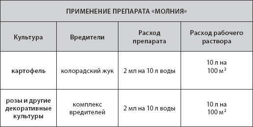 «Молния» (флакон 10 мл, ампула 2 мл) – это новый высокоэффективный препарат от колорадского жука на картофеле и комплекса вредителей на розах и других декоративных растениях. «Молния» обладает выраженным «нокдаун»-эффектом. Гибель насекомых наступает уже через 30 минут. Высокая активность препарата сохраняется в течение 2–3 недель. Специальные добавки обеспечивают устойчивость к смыванию дождем. Подавляет развитие паутинных клещей. Это позволяет избежать дополнительной обработки специализированным средством от паутинных клещей.