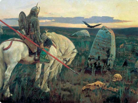 «…Едучи путём-дорогою, близко ли, далёко ли, низко ли, высоко ли, скоро сказка сказывается, да не скоро дело делается, наконец приехал богатырь в чистое поле, в зелёные луга. А в чистом поле на распутье дорог стоит мрачный седой камень, поросший мохом. На нём – зловещая надпись: «Кто поедет от камня сего прямо, тот будет голоден и холоден; кто поедет в правую сторону, тот будет здрав и жив, а конь его будет мёртв; а кто поедет в левую сторону, тот сам будет убит, а конь его жив и здрав останется» [2].
