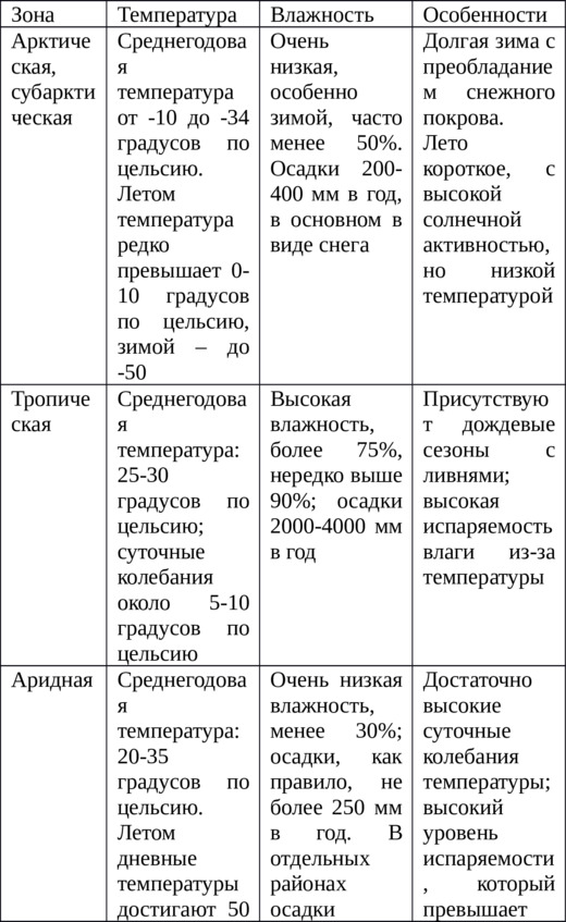 Таблица. Характеристики температурно-влажностного режима различных природно-климатических зон