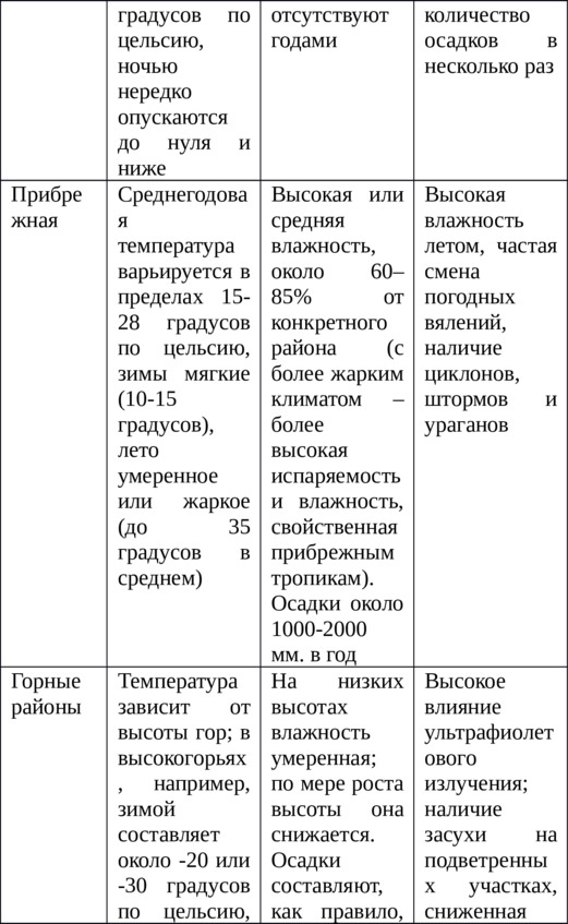 1.1.1 Температурно-влажностный режимИтак, температурно-влажностный режим описанных регионов и их характерные особенности сгруппированы нами в таблице далее: