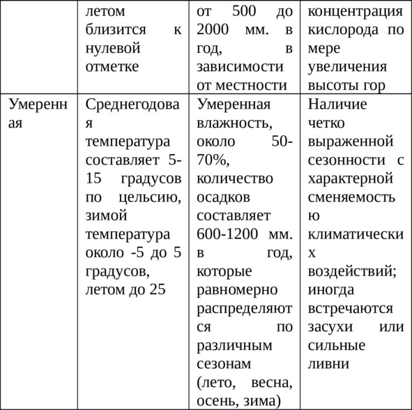 Наконец, умеренные зоны, к которым относятся страны Центральной Европы (включая Европейскую часть России), США и т. п. Здесь климат более равномерный – присутствует четкая сменяемость времен года – зимы, весны, лета, осени; летом средняя температура колеблется от 15 до 25 градусов по цельсию, зимой опускается ниже нуля, либо находится около нулевой точки. Умеренные зоны отличаются равномерностью осадков, плодородностью почвы и в целом более благоприятным для проживания климатом.