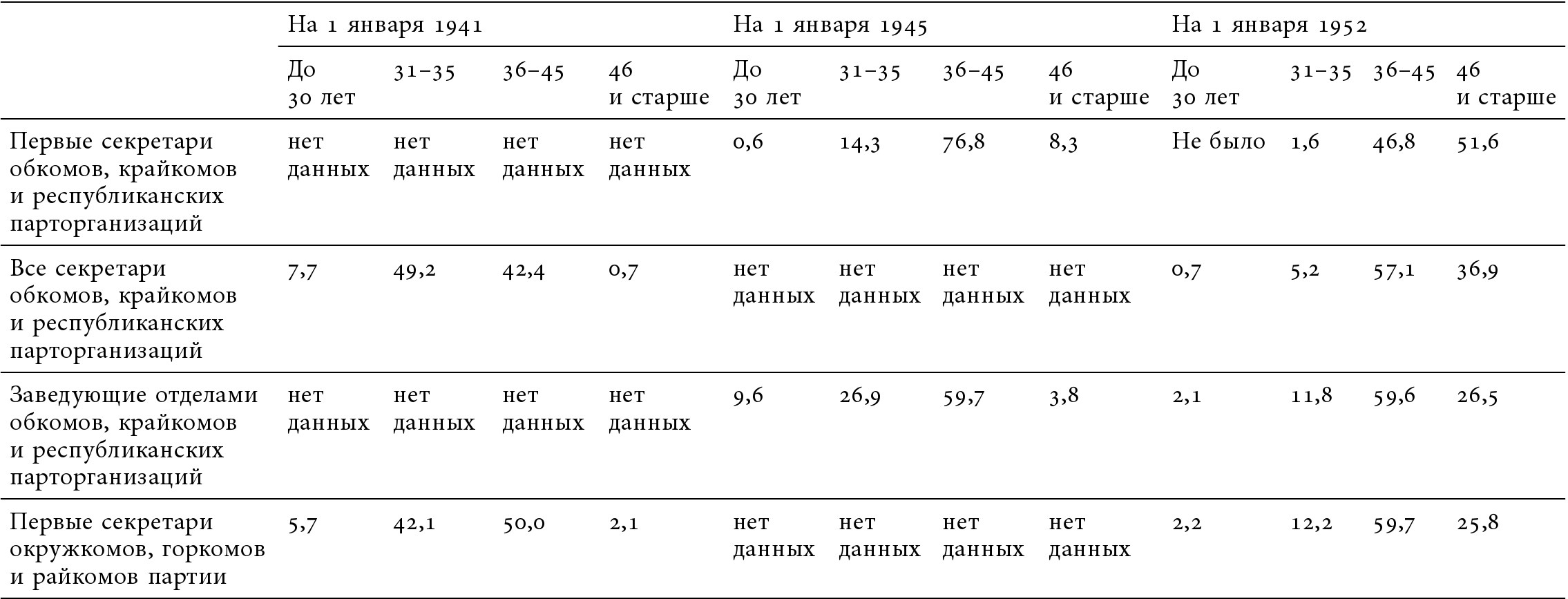 Результатом стабилизации номенклатуры в целом и ее региональной составляющей было повышение среднего возраста работников. Как видно из таблицы 8, всего за семь лет, с 1945‐го по 1952 год, произошло заметное старение первых секретарей обкомов, крайкомов и республиканских парторганизаций. Доля этих секретарей в возрасте от 46 лет и старше, составлявшая в январе 1945 года чуть более 8 %, в 1952 году превысила 51 %. Старение прочих категорий функционеров, включая всех секретарей обкомов, крайкомов и республиканских парторганизаций, заведующих отделами этих комитетов, а также первых секретарей окружкомов, горкомов и райкомов партии, было тоже заметным, хотя и не столь ярко выраженным. Обозначилось совпадение должностного старшинства секретарей со старшинством по возрасту. Доля функционеров, возраст которых превышал 45 лет, уменьшается соответственно снижению их положения в региональной партийной иерархии.