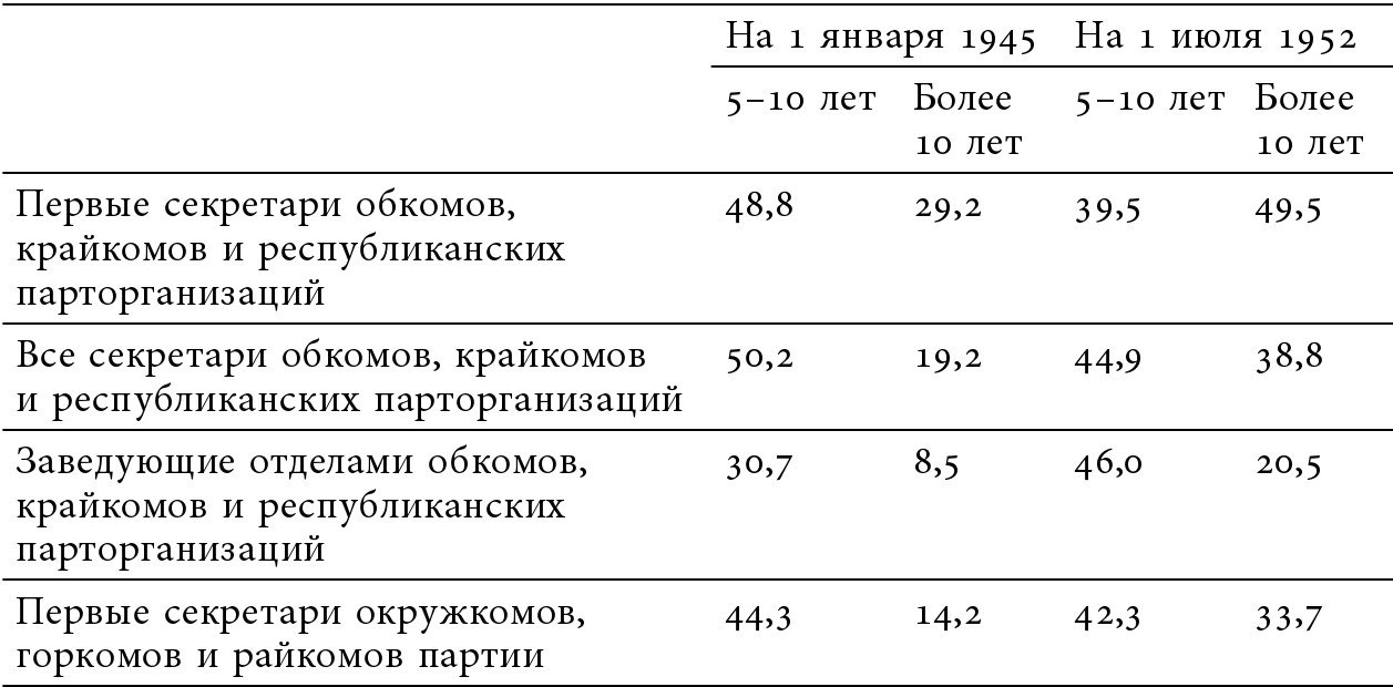 Второй показатель личного старшинства был связан со сроком пребывания в партии и, соответственно, стажем руководящей работы. Из приведенных в таблице 9 данных следует, что с течением времени все большая доля региональных партийных руководителей имела стаж работы в аппарате не менее 10 лет – иными словами, начинала свои карьеры накануне или на первых этапах войны. Первые секретари имели в этом отношении также очевидные преимущества.