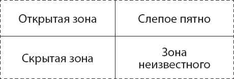 И наоборот, мы страдаем, если вторая, спрятанная зона у нас забита тем, чего мы стыдимся и стараемся скрыть. Когда же многие наши качества скрыты от нас самих в слепом пятне, третьей зоне, то страдают другие. А мы мучаемся косвенно, потому что не можем решить проблемы, о которых нам говорят. Если многие наши качества находятся в четвертой зоне, значит, мы не до конца реализуем свой потенциал.