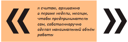 Какую работу должен делать сам предприниматель, а какую – делегировать? На начальном этапе предприниматель должен всё делать сам. Если в первый месяц или в первую неделю он начнёт что-то делегировать – это совсем не предприниматель. На это есть две причины. Первая – нет денег или их совсем мало. Тут не до аутсорсинга! Нужно максимально использовать свои деньги. Вторая. На мой взгляд, технология лучше всего работает в том случае, когда бизнесмен сам проходит все этапы пути, сам понимает досконально, что происходит. Даже разгрузить машину с товаром полезно, потому что потом будешь понимать, как устроена работа грузчика. И затем, при оплате подобной работы учтёшь, где грузчик может схитрить или обмануть тебя. Я считаю, архиважно в первые недели, месяцы, чтобы предприниматель сам, собственноручно сделал максимальный объём работы. Даже если она не совсем знакома, понятна и любима. Но это даст определённый багаж знаний, который поможет в дальнейшем.