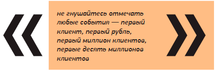 Не гнушайтесь отмечать любые события – первый клиент, первый рубль, первый миллион клиентов, первые десять миллионов клиентов. Важно зафиксировать в своём мозге этапы успеха. Это метафизика. Потом успех транслируется на дальнейший рост и развитие организации. Если ты не успешен – твой бизнес тоже не успешен. Если ты не мыслишь позитивно, у тебя нет так называемого positive thinking, то ничего не получится.