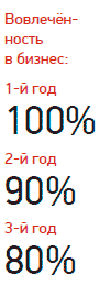 В России, особенно в маленьких бизнесах – а книгу, я так понимаю, читают в основном начинающие и средней руки предприниматели, – это не работает по 250 причинам. И даже у меня в банке это не работает, потому что вовлечённость предпринимателя должна быть. Но самое правильное, на мой взгляд, соотношение, когда предприниматель вовлечён в бизнес на 100 процентов в первый год, на 90 процентов – во второй, на 80 процентов – в третий и т. д. Вот моя формула, запишите!