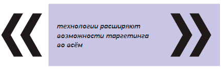 Технологии расширяют возможности таргетинга во всём. Это значит, что реклама будет дешевле и эффективнее, вам не надо стрелять из пушки по воробьям, заинтересовать нужно именно морально готовых к покупке товара или услуги людей.