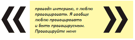 Проводя интервью, я люблю провоцировать. Я вообще люблю провоцировать и быть провоцируемым. Провоцируйте меня! Но, к сожалению, в нашем российско-советском болоте мало провокаций. Это касается коммуникаций, рекламы, маркетинга, журналистики. Когда ты провоцируешь человека, ты выводишь его на другую траекторию, другие ощущения. Он будет раскрываться иначе.