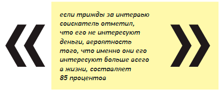 Также я очень осторожно отношусь к излишне религиозным людям. Причём совершенно не важно, какого рода у них верования – православные или сектантские. Религия – это интимная внутренняя составляющая. И если человек выпячивает её на интервью, что-то у него неправильно сбалансировано. Он пытается что-то показать, как правило, что он честный, порядочный. А на деле может получиться как раз наоборот. Если трижды за интервью соискатель отметил, что его не интересуют деньги, вероятность того, что именно они его интересуют больше всего в жизни, составляет 85 процентов. Если он 3 раза за час повторил, что очень честный, вероятность того, что это не так, стремится к 100 процентам.