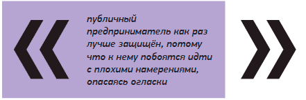 Впрочем, если вы бывший бандит, то как раз знание этого факта создаст ещё больший дискомфорт для клиента. Но проблема в том, что в России предпочитают прятаться не только бандиты, но и обычные предприниматели. Они спрашивают: зачем светиться? Думают, что будут завидовать, вымогать, просить… Но с чего они взяли, что если публике ты неизвестен, то к тебе не придут люди в сером и не потребуют деньги или бизнес?