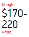 За три последних года чистая прибыль составила почти 20 миллиардов долларов. Google покупает чуть ли не по одной компании в день. Они купили себе офисный центр в Нью-Йорке за два миллиарда долларов. Google покупает всё подряд, инвестирует во всё подряд, нанимает самых дорогих людей, повышает зарплату. Наверное, это рациональная позиция. У компании с большим объёмом кэша капитализация всегда меньше, так как она не знает, что с ним делать. На момент, когда я это пишу, Google стоит 170 миллиардов долларов, а на максимуме оценивался в 220 миллиардов.