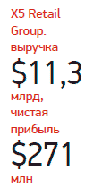 В целом же X5 Retail Group пока опережает «Магнит» по выручке, так как включает несколько сетей. Помимо «Пятёрочки», это 303 супермаркета «Перекрёсток», 71 гипермаркет «Карусель» и 650 магазинов «Копейка». В 2010 году выручка X5 Retail Group составила 11,3 миллиарда долларов, чистая прибыль – 271 миллион долларов. У «Магнита» выручка равна 7,8 миллиарда долларов при прибыли 334 миллиона долларов. Видите, «Магнит» прибыльнее. Сергей Галицкий оказался очень сильным конкурентом для Михаила Фридмана, возглавляющего «Альфа-Групп», основного акционера X5.