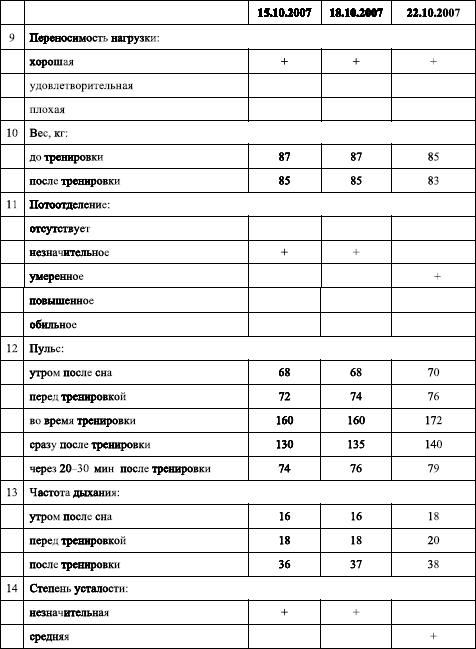 • новичком: два раза в неделю по 5–8 показателям (самочувствие, настроение, сон, аппетит, степень усталости, вес тела, частота пульса и дыхания) в день тренировки и на следующий день после нее;