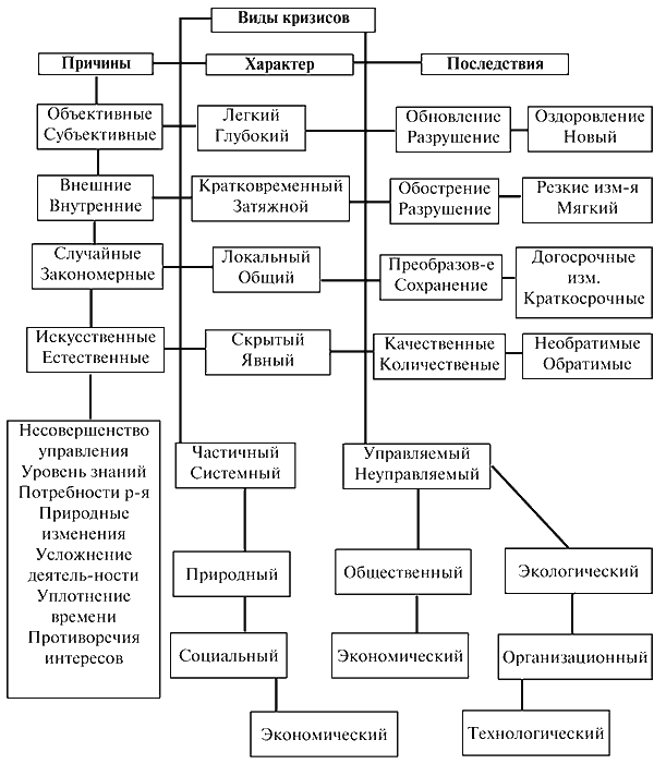 Предсказуемые кризисы могут предсказываться и возникают под воздействием объективных факторов развития – необходимости модернизации производства, бизнеспроцессов под воздействием макроэкономических факторов. Неожиданные кризисы возникают вследствие ошибок в управлении, действия сил природы, активизации социальноэкономических процессов. Разновидностью предсказуемых кризисов является циклический кризис, возникающий периодически и имеющий известные фазы своего наступления и протекания, существуют также кризисы явные и латентные (скрытые). Первые протекают заметно и просто распознаются. Вторые – скрытые, развиваются незаметно и крайне опасны. Также кризисы подразделяются на легкие и глубокие. Глубокие кризисы могут дестабилизировать части или всю социально-экономическую систему. Легкие, мягкие кризисы протекают более последовательно и безболезненно. Совокупность возможных кризисов также делится на кратковременные и затяжные. Фактор времени чрезвычайно важен в кризисной ситуации, чем длительнее кризис, тем он проходит болезненнее. Затяжные проходят болезненно и сложно. Они, как правило, связаны с отсутствием навыков управления критическими ситуациями, непониманием сути и параметров кризиса, его причин и возможных последствий.