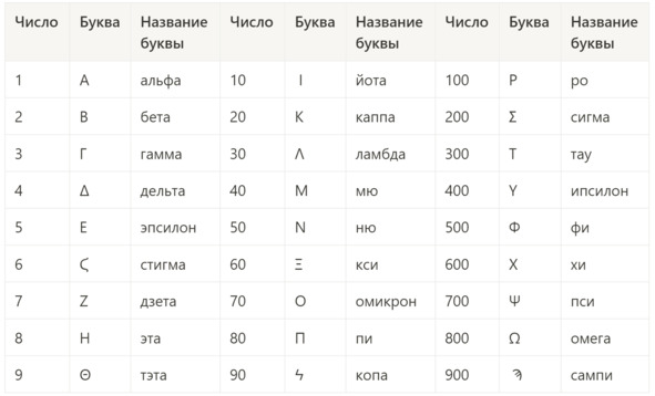 В десятичном порядке у греков могло быть только девять значащих цифр, а для нуля у них был пропуск разряда. Но зато они задействовали для счета весь свой имеющийся алфавит, содержавший на тот момент 27 букв, поэтому могли описать число сразу на три десятичных порядка. Буквам древние греки присвоили следующие числовые значения: