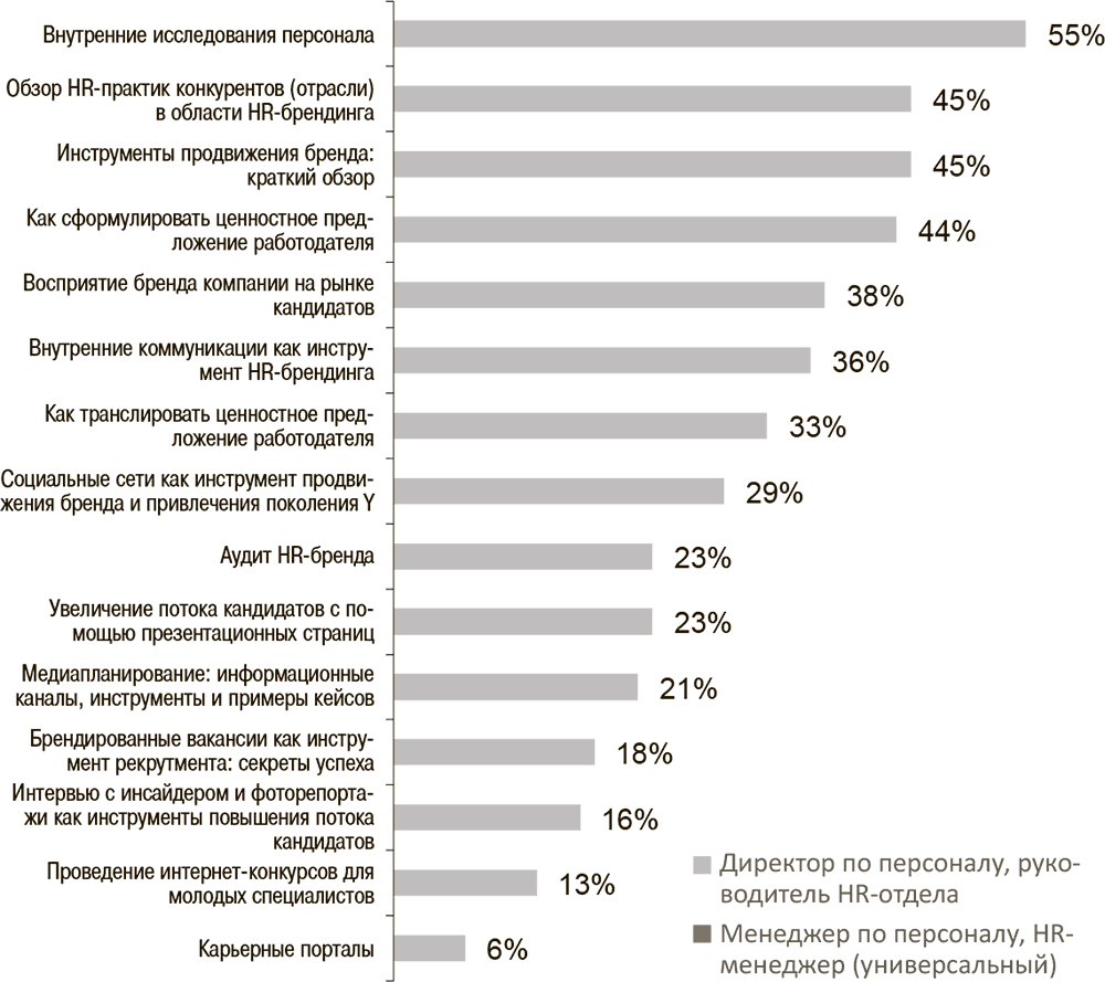 – Понимания, какой HR-бренд сейчас у компании и где существуют «разрывы» – между восприятием, текущей деятельностью, заявлениями компании и т. д. Подтверждение этого – высокий рейтинг вопросов про исследования и аудит. Причем для HR-директоров и руководителей этот вопрос актуальнее, чем для обычных специалистов.