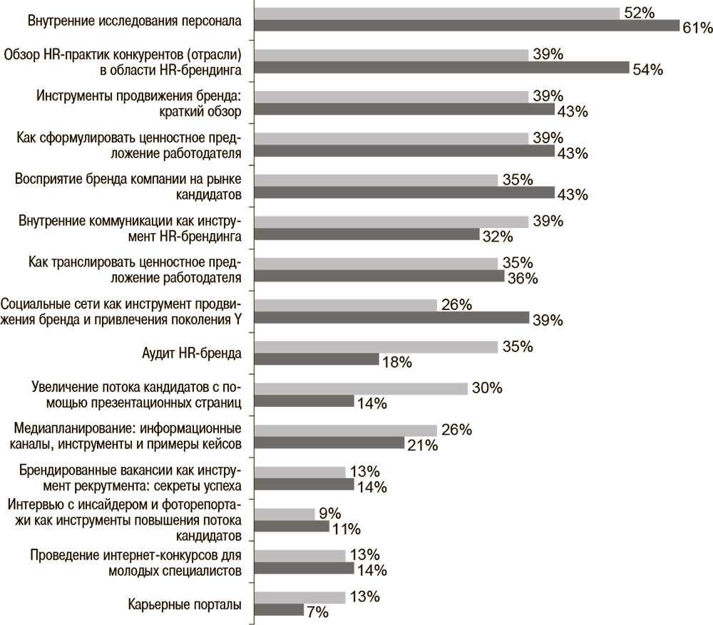 По опыту наших проектов, что подтверждают результаты опроса, возрастает интерес компаний скорее к комплексным разработкам и исследованиям в области HR-бренда, нежели к конкретным инструментам продвижения (социальные сети, карьерные порталы, вакансии и т. п.).