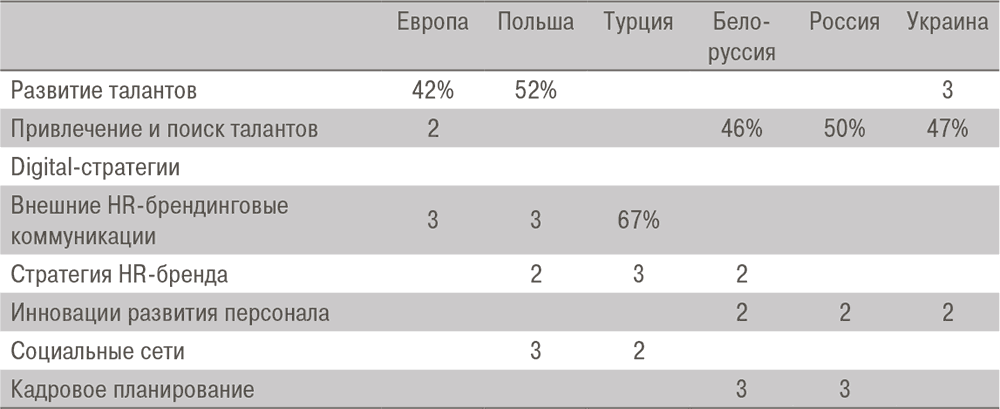 Отличия видны и в выборе направлений, в которые собираются инвестировать свои ресурсы HR-менеджеры России и Европы. Так, наиболее актуальные направления работы для России – это привлечение и поиск талантов, инновации в области развития персонала и кадровое планирование. Мировые тенденции же фокусируются на внешней и внутренней стратегии продвижения HR-бренда.