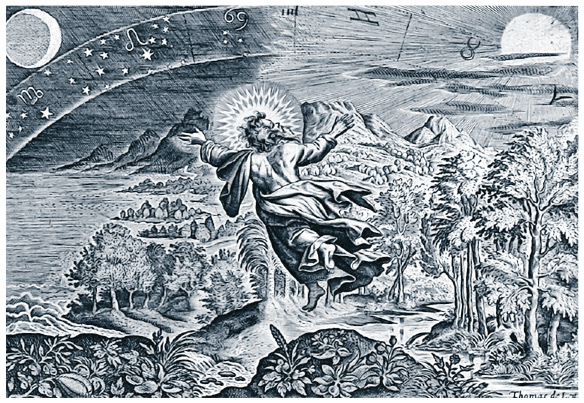 Четвертый день творения: Бог создает солнце, луну и звезды. Гравюра Т. де Леу, ок. 1600 г.