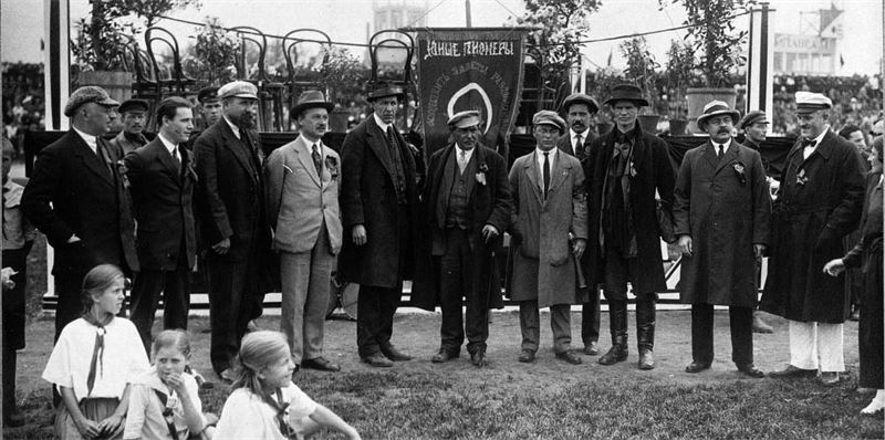 Рис. I-8 Члены Главного выставочного комитета на встрече с пионерами: (слева направо) А. Г. Брагин, А. В. Осипов, М. И. Лацис, неуст. лицо, М. Е. Шефлер, Н. Н. Нариманов, Н. М. Анцелович, Г. И. Лебедев, С. К. Чаянов, Б. В. Ульпи. Из еженедельника «Иллюстрированное приложение к газете „Экономическая жизнь“». Вып. VI. Сентябрь 1923 г.