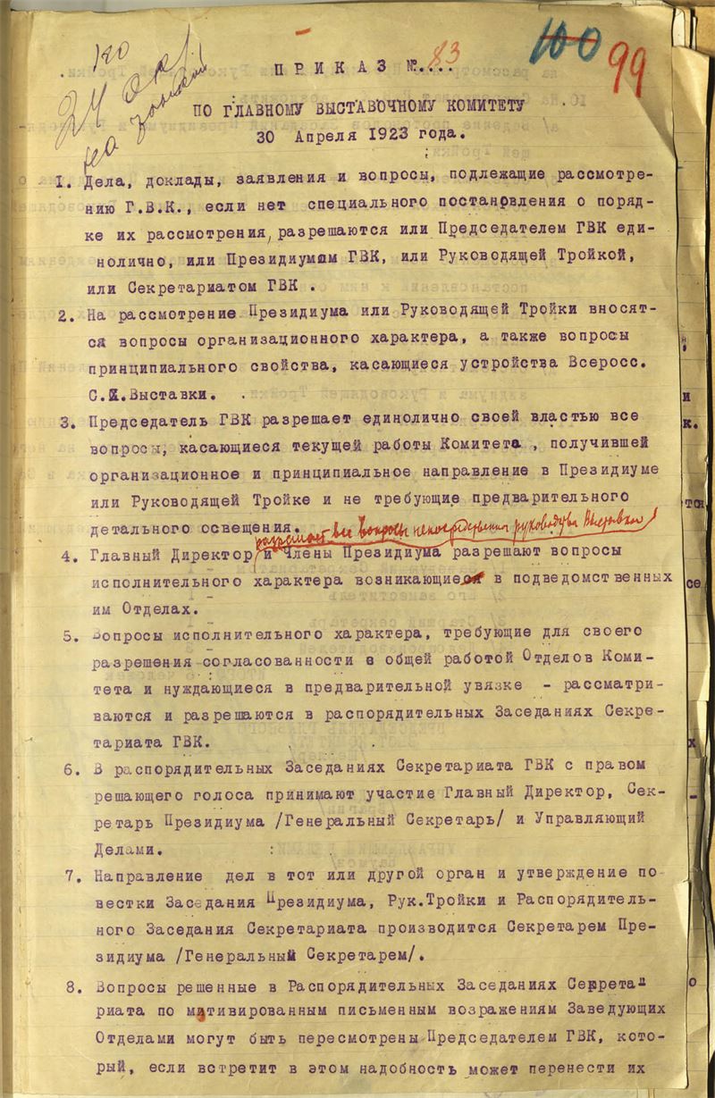 Рис. I-9 Приказ по Главному выставочному комитету от 30 апреля 1923 г. о порядке решения вопросов внутри руководящих структур комитета. РГАЭ. Ф. 480. Оп. 1. Д. 95. Л. 99—99об.