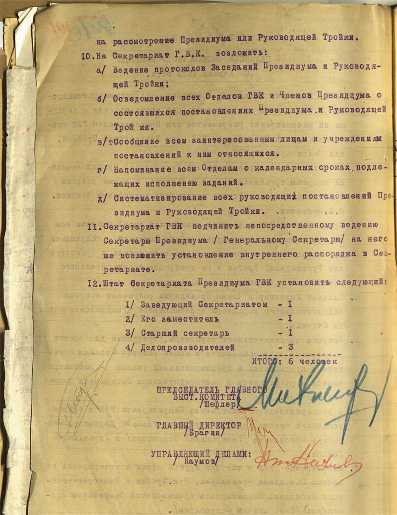 В результате в ответственный период утверждения архитектуры павильонов, концепции экспозиций, отбора экспонатов, составления договоров с экспонентами и пр. ГВК являл собой структуру, с одной стороны, хорошо приспособленную для покрытия всего фронта проблем и вызовов рабочего процесса, с другой – малоэффективную в случае необходимости сбора для экстренного принятия решений. Поэтому к концу февраля 1923 г. для оперативного реагирования была учреждена так называемая руководящая, или ударная тройка, триумвират ГВК в составе председателя Шефлера, директора Брагина и главы иностранного отдела Анцеловича[142]142