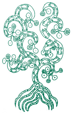 На наружной поверхности земной сферы, недалеко от “небесного рта”, растет железное дерево (48) с тремя ветвями (на “карте” оно по случайным обстоятельствам изображено вверх ногами). Это дерево мифической железной птицы “кори” (49), которая изображена рядом. Нос ее представляет собою пешню, концы крыльев – сабли, хвост – копье на медведя. ‹…› Орочи говорили, что раньше были такие сильные шаманы, которые могли спускаться в загробный мир, причем возвращались они оттуда не непосредственно, а через лунную землю. От них орочи и узнали об устройстве загробного мира. Теперь таких сильных шаманов не бывает»[23]23