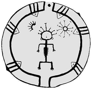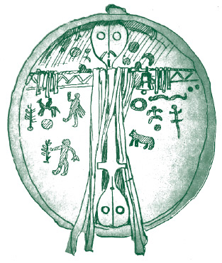 А на рукоятке другого алтайского бубна мы видим уже две личины. Верхнее изображение – это шаман-предок, а нижнее – его жена, дочь Ульгеня, бога Верхнего мира. Она также помогала шаману во время камлания, давала ему силу – подобно тому, как ранее она давала волшебную силу своему супругу-первошаману. Отметим, что здесь женский персонаж – не шаманка, а божество, покровительствующее шаману, как и в следующем примере.