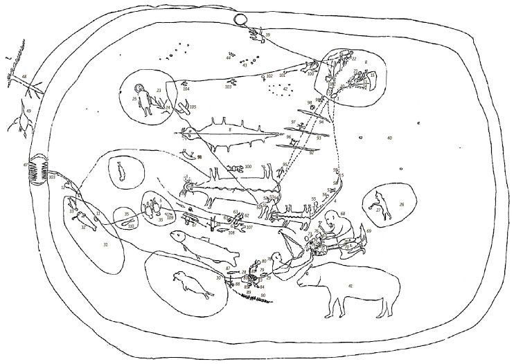 Северо-восточнее Сахалина (на “карте” – ниже и правее) расположено небольшое проточное озеро (28), играющее большую роль в формировании душ шаманов. ‹…› С севера в него впадает река (29). Другая река вытекает из этого озера и соединяет его с моржовым морем (30). Юго-западнее (левее и несколько выше) находится китовое море (31), хозяин которого изображен в его центре (32). Хозяин китового моря питается живущими в этом море человекорыбами (33). Западнее (34) изображено море хозяина рыб, в котором рождаются все рыбы. Сам хозяин рыб представляет собою большого размера рыбу с человеческой головой. Это очень злое и опасное существо. На спине у него девять злых духов-помощников. Северо-восточнее расположено море хозяина воды (35). В нем живут хозяин воды (36) и его “старуха” (жена) (37). Когда хозяин воды поймает рыбу лососевой породы, его жена чистит рыбу и чешуя превращается в рыб. Рыбы направляются к берегам земли. Этим орочи и объясняют массовый ход лососевых (симы, кеты, горбуши). Между морем хозяина воды и китовым морем находится еще одно небольшое море (38), служащее загробным миром для утопленников.