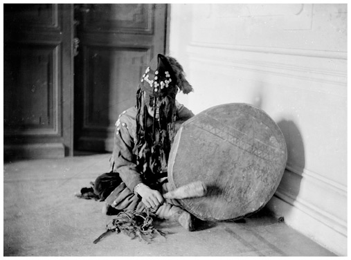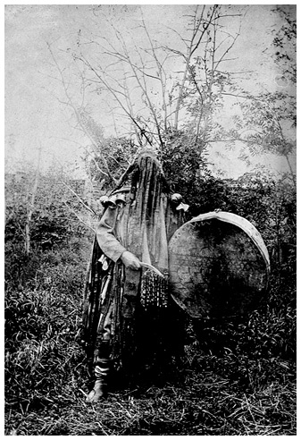 Хакасский шаман в церемониальной одежде, с закрытым лицом, с бубном в руках. Минусинск, около 1920 года.