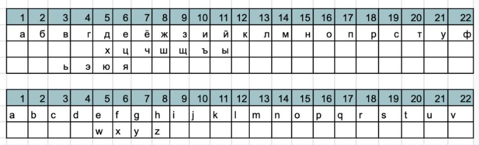 Алфавит для перевода из букв в цифры: