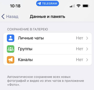 – Телеграм: Настройки Данные и память Сохранение в галерею Поставьте «нет» и для личных чатов, и для групп, и для каналов.