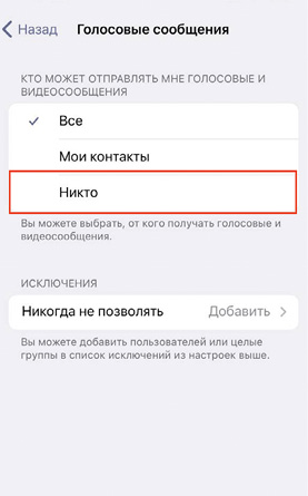 Если вы совсем не хотите получать голосовые, то в Телеграме с подпиской «премиум» можно запретить пользователям присылать вам голосовые сообщения (Настройки Конфиденциальность Голосовые сообщения). Причем можно запретить сразу всем или только отдельным пользователям. Тогда у пользователей даже технически не будет возможности отправлять звуковые дорожки.
