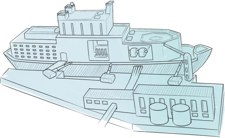 Плавучая атомная теплоэлектростанция – это береговые сооружения и плавучий энергоблок – реакторная установка малой мощности, которая водружается на специальное судно с двойным дном и двойными бортами. В носовой и средней части судна размещается оборудование, в кормовой живет обслуживающий персонал.