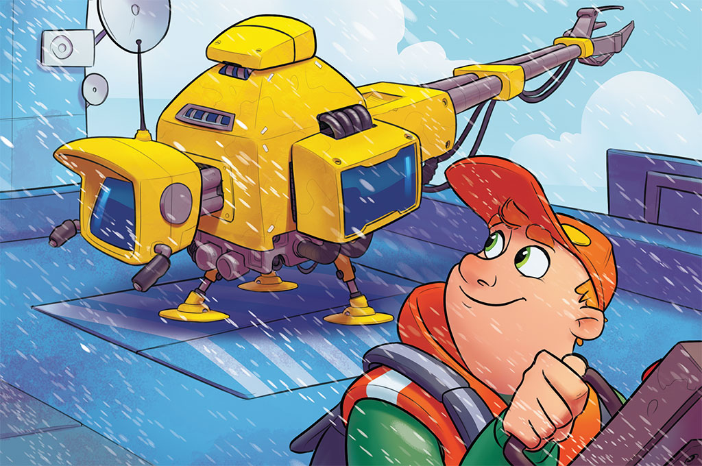 Оказалось, под действием рычага отрылись затворки, и на крышу на специальной площадке поднялся прибор. Желтый, навороченный, в два раза больше снегохода.