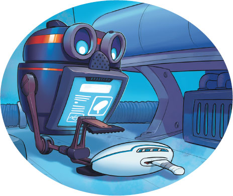 Потом из стены вылетел небольшой робот с монитором, на котором горели две лампочки, похожие на глаза. Робот тоже висел в воздухе, хотя ни крыльев, ни винта у него не было. Он пролетел в машину времени и подхватил с пола пистолет Льва. Пистолет исчез.
