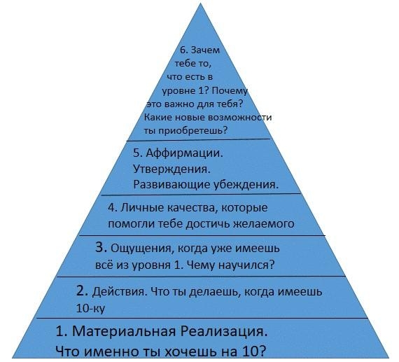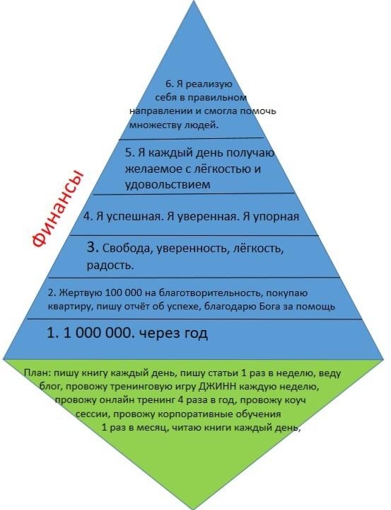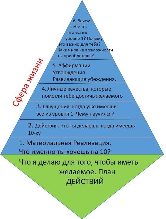 ● Определившись с основными сферами, опиши каждую поочередно по алгоритму ХОД. Запиши все пункты в виде пирамиды, начиная с самого низа. В основе пирамиды то, какой ты видишь эту сферу через год. На 10 из 10. Что должно быть через год, чтобы ты поставил себе 10-ку. Не забывай, описание в первом уровне – это материальная реализация. Второй уровень, что ты делаешь, когда имеешь свою 10-ку. Третий – что ты тогда ощущаешь, чему научился и какие твои индивидуальные качества помогли тебе получить желаемое. Четвертый – развивающие убеждения, утверждения и аффирмации, которыми ты будешь себя программировать весь ближайший год. Пятая ступенька – важность этой 10-ки для тебя. Зачем тебе именно такая реализация выбранной сферы. И какие новые возможности у тебя появятся.