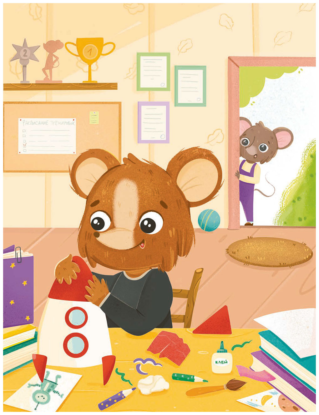 После игр на лужайке По заскочил к Стёпе, чтобы взять у него новые книги про космос. Стёпа открыл шкаф и сразу же достал их.