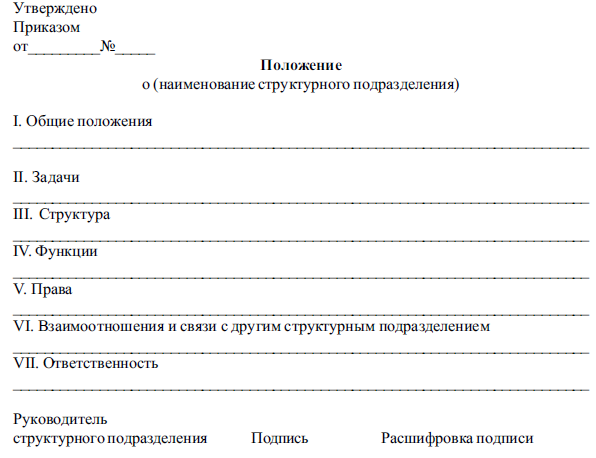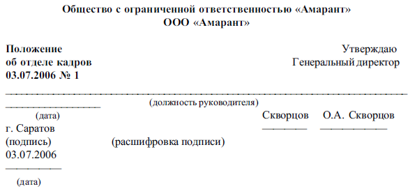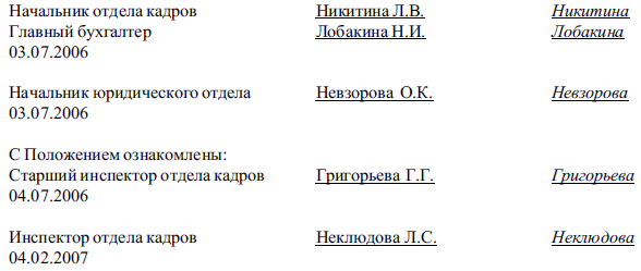 Для того чтобы заложить эффективную систему и методы руководства и управления специалистами по кадровой работе, работодатель может разработать локальный нормативный акт – Положение об отделе кадров. Названное Положение определяет цели и задачи кадровой службы, порядок ее деятельности. На его основании проще организовать работу кадровой службы. Если у работодателя есть в штате кадровые работники и юрисконсульт, то он может дать им задание разработать названное Положение, так как они являются профессионалами. Если работодатель не имеет вышеуказанных работников, но он собирается организовать кадровую службу, то он сам может разработать такое Положение. Положение об отделе кадров имеет общую структуру (см. приложение 1 к данной главе). Образец Положения приведен в приложении 2. Положение о кадровой службе должно быть утверждено руководителем организации. Когда на этом документе будет стоять гриф «Утверждено», то это означает, что Положение имеет юридическую силу, и для введения его в действие никаких дополнительных приказов издавать не нужно. Затем этот акт дают для прочтения всем сотрудникам отдела кадров, которые должны поставить на нем визу ознакомления.