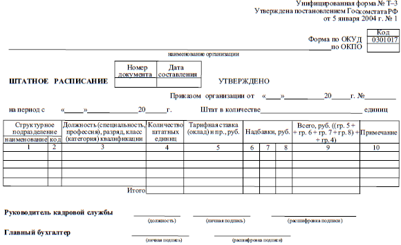 Составлять штатное расписание необходимо по форме Т-3. Это унифицированная форма, рекомендованная постановлением Госкомстата России «Об утверждении унифицированных форм первичной учетной документации по учету труда и его оплаты». Грамотно и правильно оформить штатное расписание помогут Указания по заполнению формы Т-3 (см. приложение 4 к данной главе).