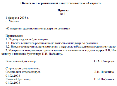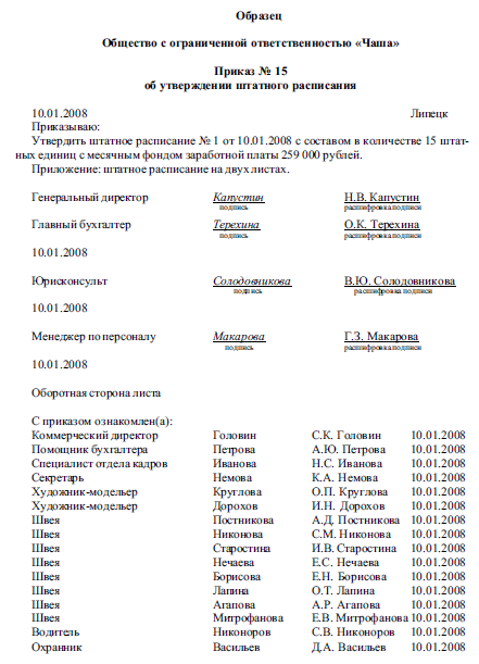 После утверждения штатного расписания в соответствующем приказе составляют должностные инструкции (см. главу 4 «Должностная инструкция») к каждой должности и начинают принимать работников.