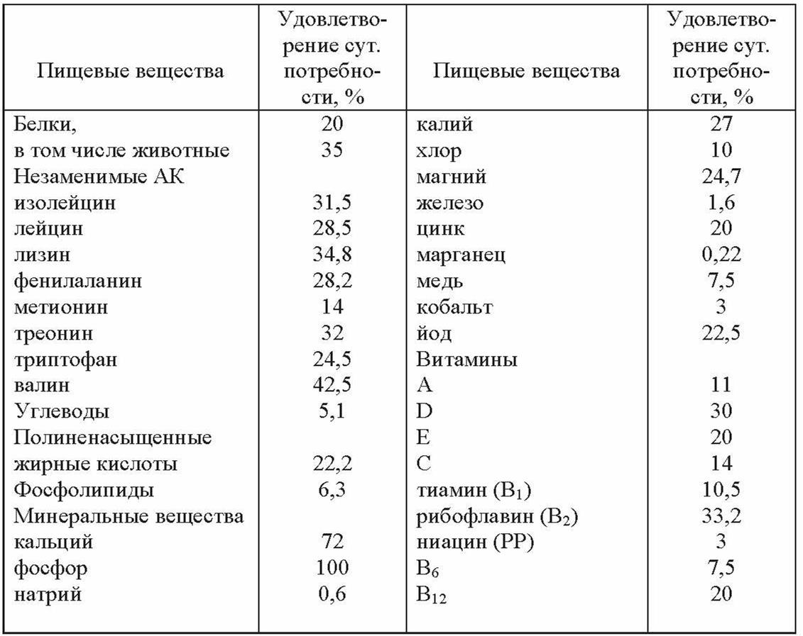 Таким образом, употребление всего лишь 0,5 л молока удовлетворяет суточную потребность в животных белках на 35 %, минеральных веществах – кальций и фосфор, соответственно, на 72 и 100 %.