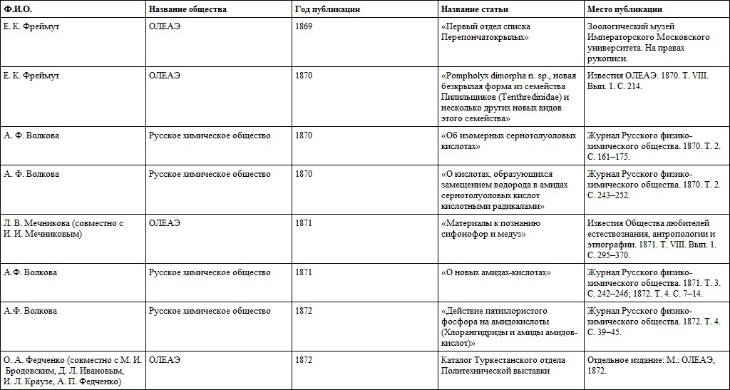 Таблица 3. Первые публикации женщин в периодических изданиях российских естественно-научных обществ (60–70-е гг. XIX в.)