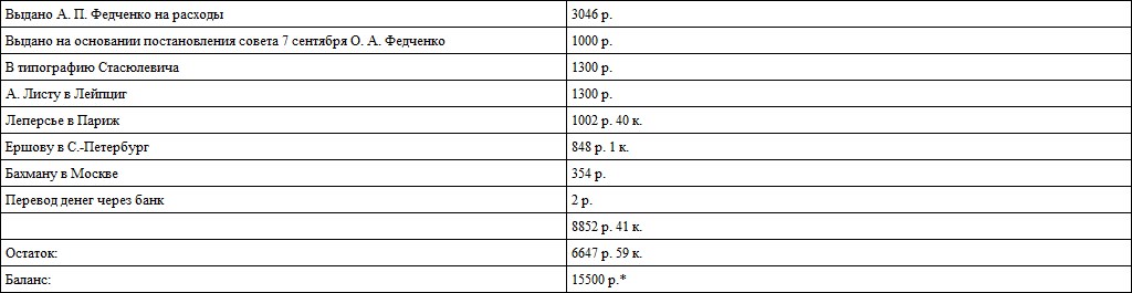 Между тем финансовые дела издания находились в некотором расстройстве. Изначально средства на издание «Путешествия в Туркестан А. П. Федченко» были перечислены на счет ОЛЕАЭ. Общество, в свою очередь, доверило Алексею Павловичу распоряжаться ими по своему усмотрению763763